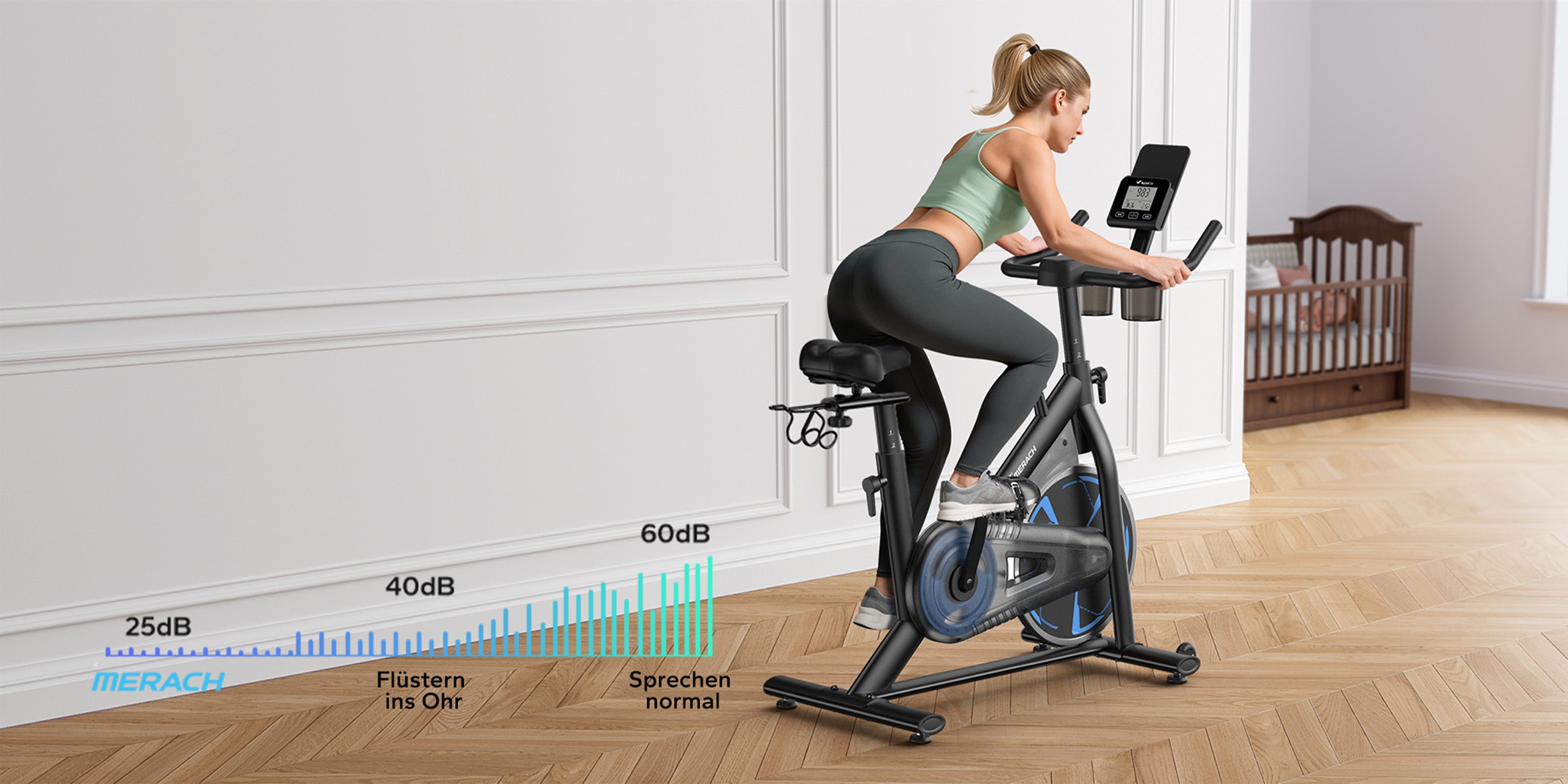 Stabil, leise (<25 dB) und voll verstellbar – das MERACH Bike bietet stufenlosen Widerstand, App-Anbindung für Echtzeit-Tracking und hohen Trainingskomfort.