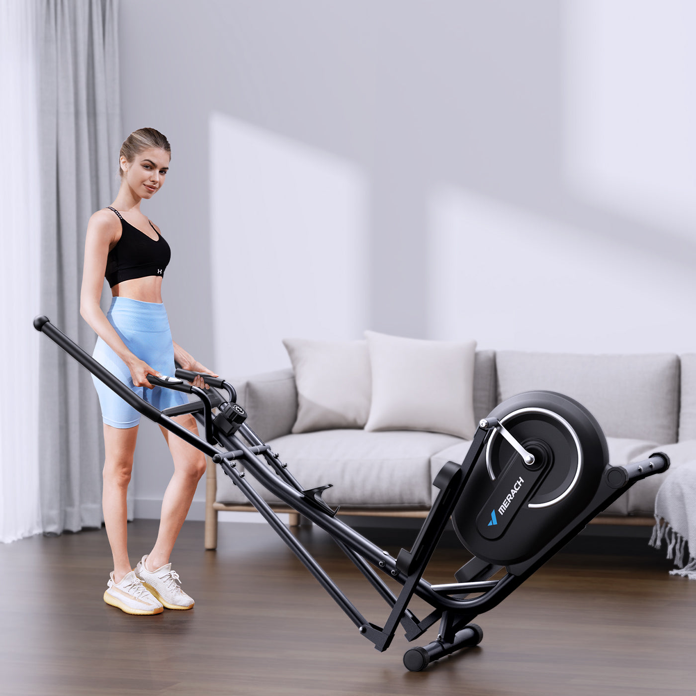 Merach cardio elliptical trainer with magnetic resistance system High-quality materials and precise workmanship of the belt drive system ensure that noise does not disturb your concentrated training and you remain in a pleasant training mood.