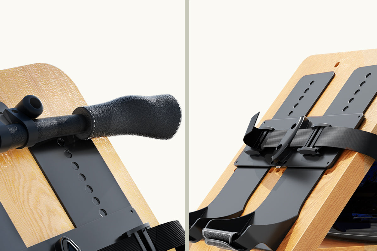 Die erhöhte Reling des Rudergeräts macht es für größere Benutzer bequemer, und die verbesserten Ledergriffe und Fußschlaufen verhindern Blasen und Verletzungen.