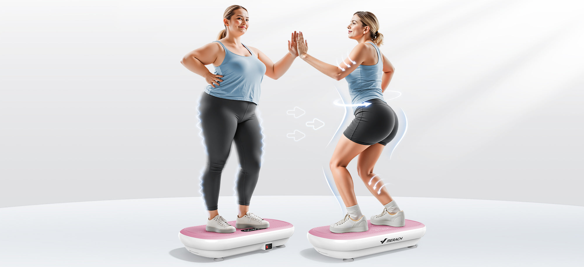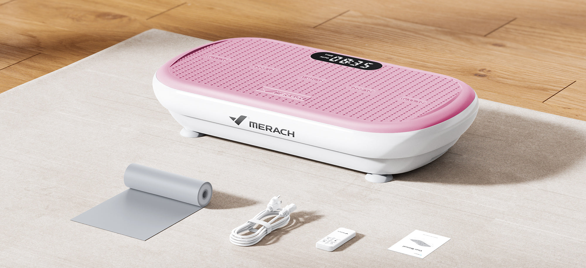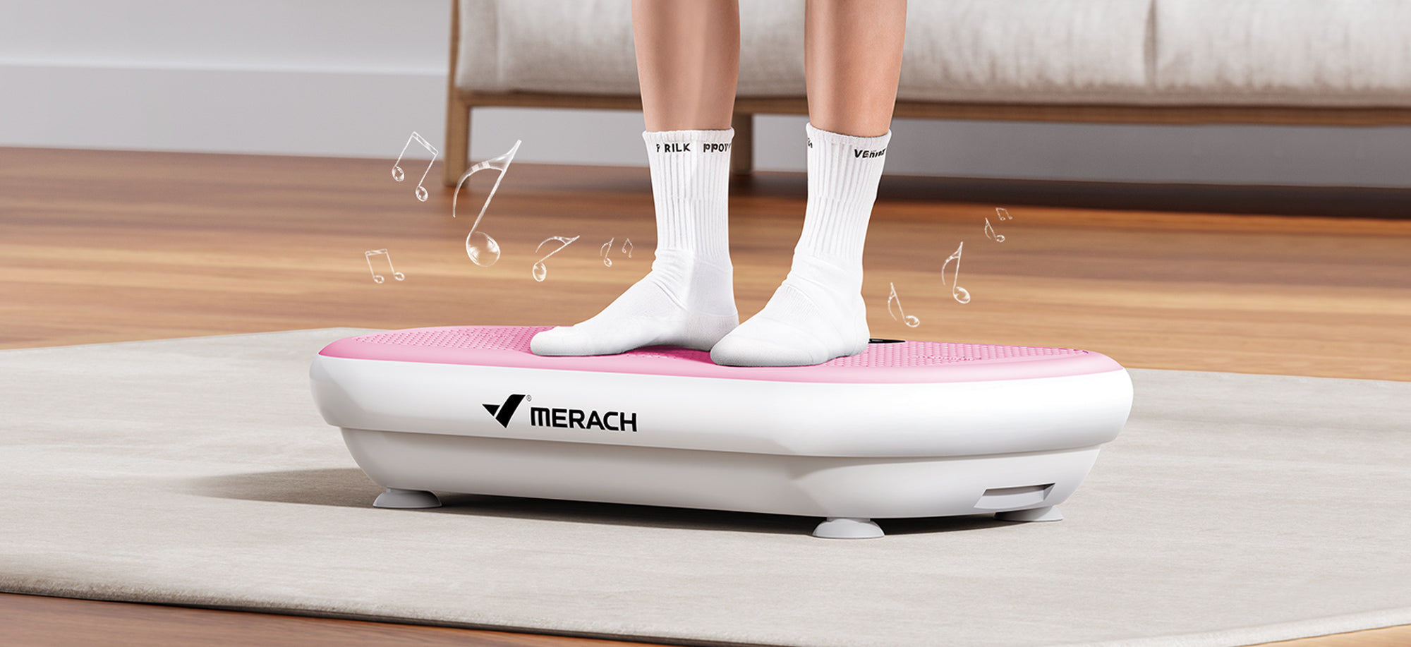 Merach Vibrationsplatte mit 200 kg Tragkraft, Bluetooth, 10 Trainingsmodi, automatischer Geschwindigkeitsanpassung und Silikonpedalen – ideal für effektives Heimtraining und Lymphdrainage.