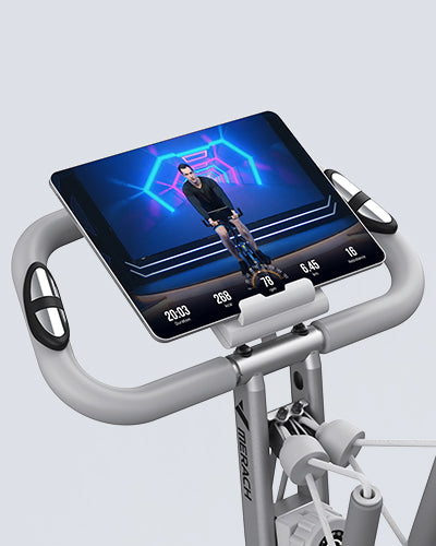 Auf dem interaktiven LCD-Bildschirm können Sie Ihren Trainingsfortschritt und andere Daten in Echtzeit verfolgen. Mit Hilfe eines Tablet-Ständers können Sie während des Trainings Anleitungen abspielen. Das faltbare MERACH-Ergometer erfüllt Ihre vielfältigen Bedürfnisse. (Tablette nicht enthalten)