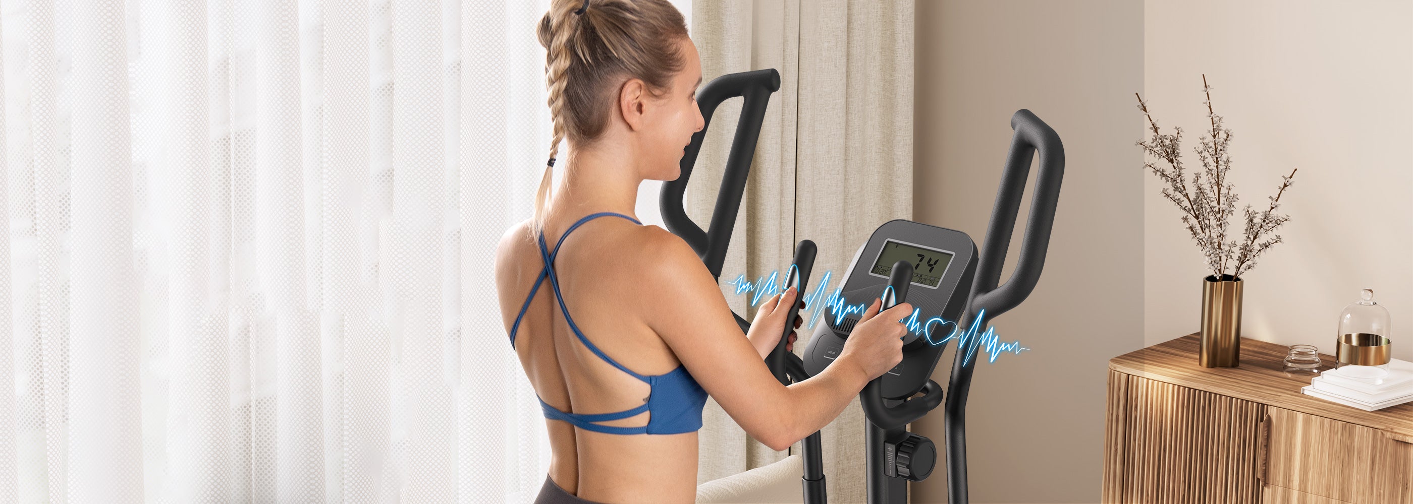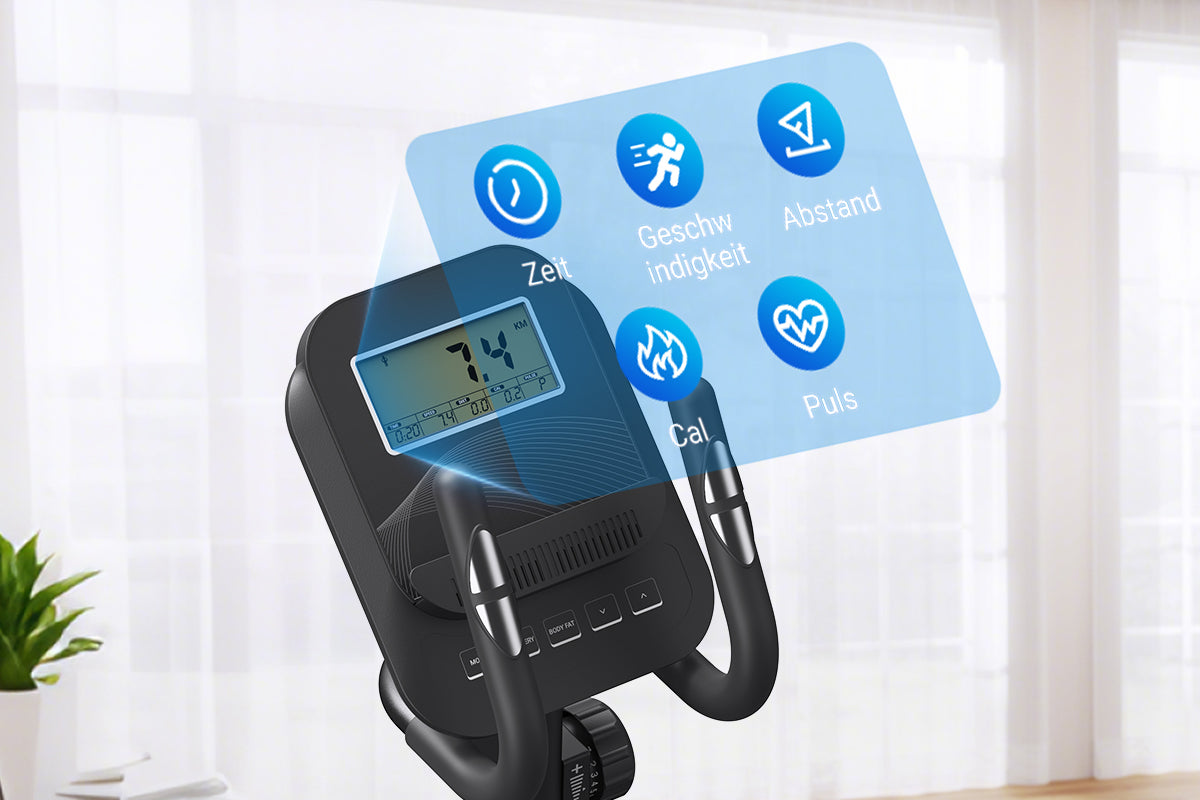 Der Ellipsentrainer mit LCD-Bildschirm zeigt die wichtigsten Daten wie Herzfrequenz, Zeit, Strecke, Kalorien und Geschwindigkeit an, so dass Sie Ihren Trainingsplan entsprechend den Daten anpassen und die Trainingsergebnisse verbessern können.