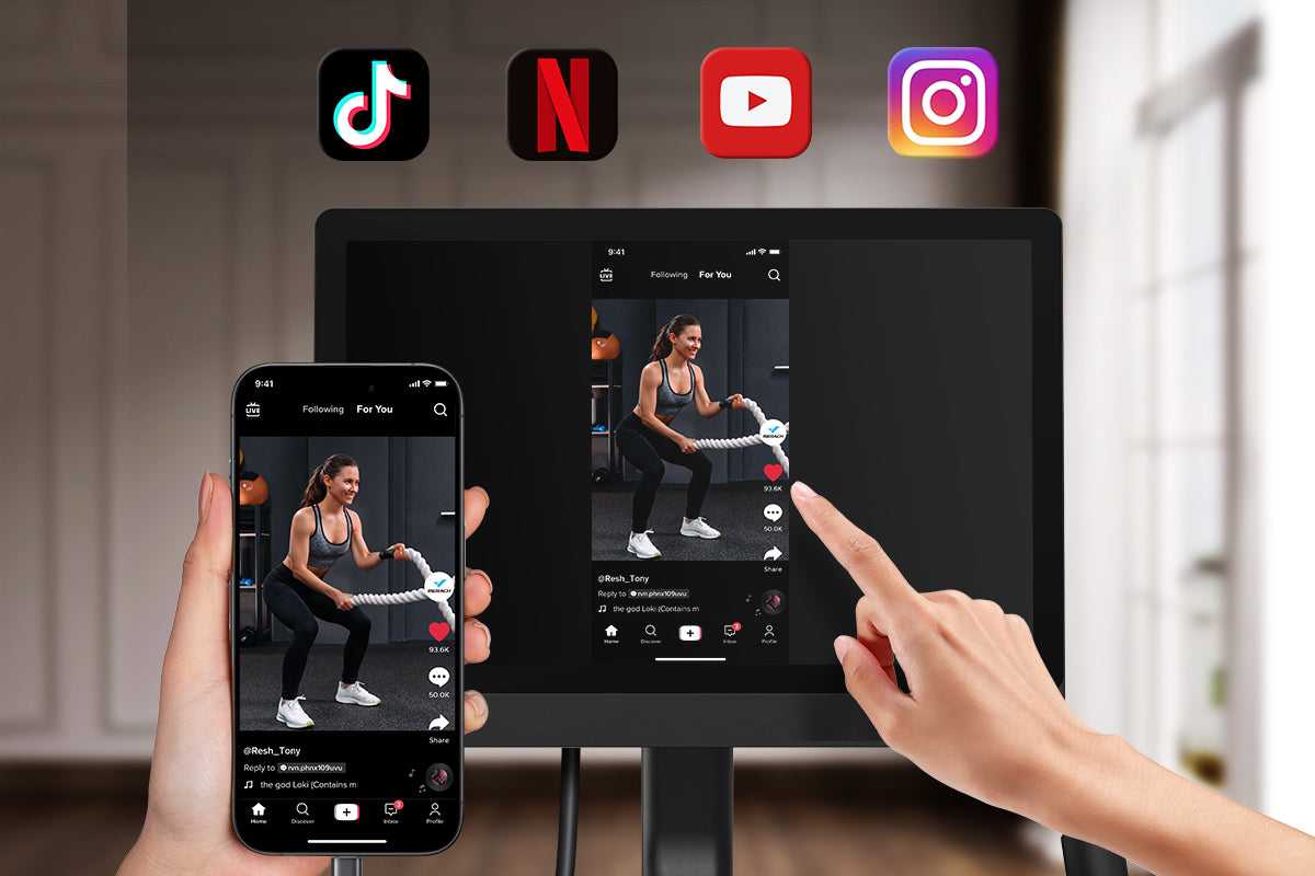 Mit unserem Heimtrainer können Sie Filme oder andere Kurse von Ihrem Handy auf den Bildschirm projizieren. So wird das Training zu einem Vergnügen und nicht zu einer langweiligen mechanischen Übung.