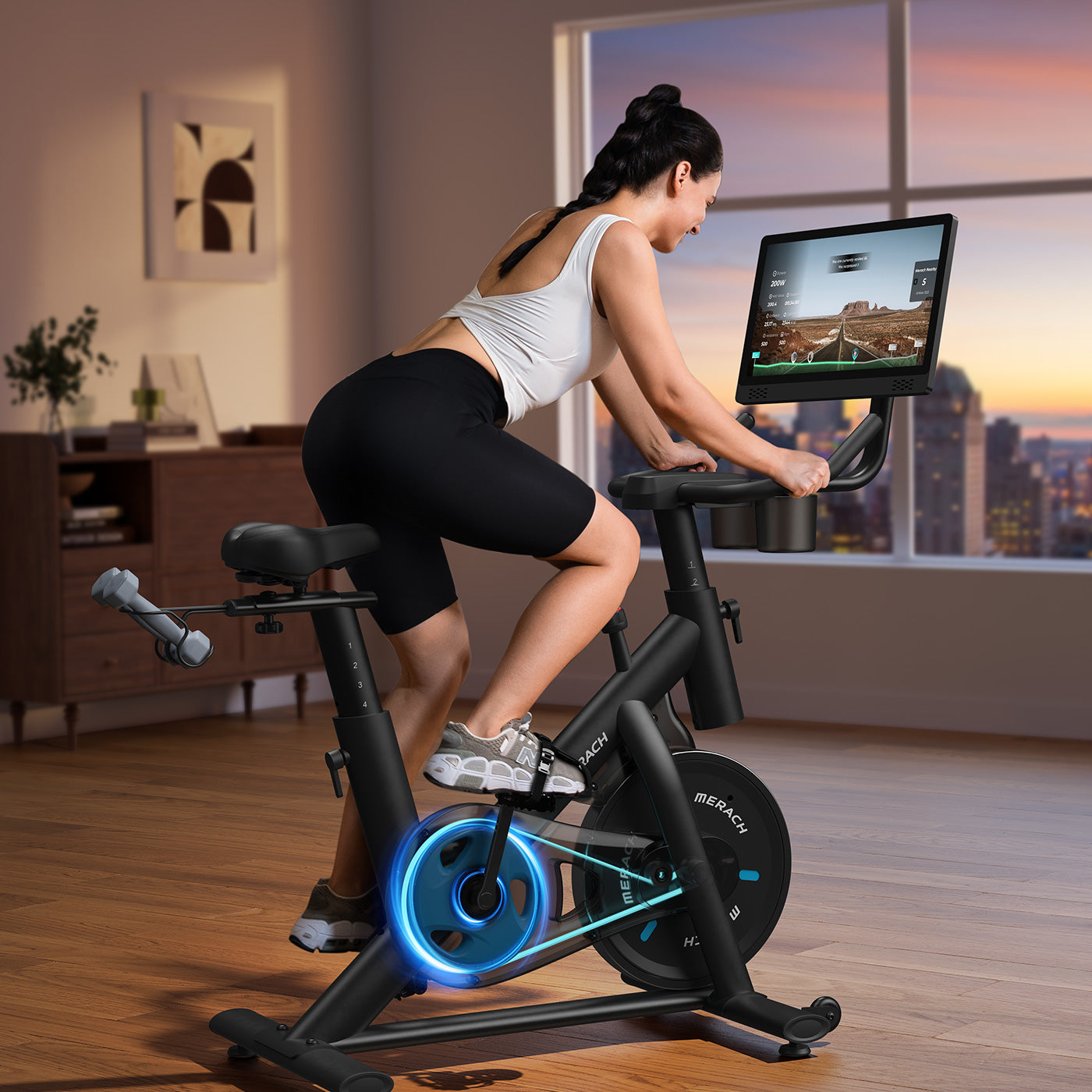 Das Merach Fitnessbike bietet ein 39,6cm 1080P HD-Bildschirm für ein immersives Trainingserlebnis. Die kostenlose MERACH-App synchronisiert Echtzeitdaten wie Kalorien, Distanz und Widerstand, begleitet von interaktiven Kursen und Spielen. Perfekt für motivierende Workouts zu Hause!