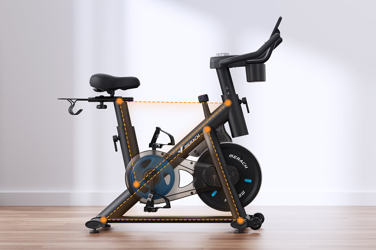 Das stabile, umgekehrte Dreieck-Design des Merach Rahmens sorgt für maximale Stabilität. Durch die Ein-Stück-Stanztechnik und weniger als 5 Schweißpunkte kann die Maschine problemlos 122 kg tragen.