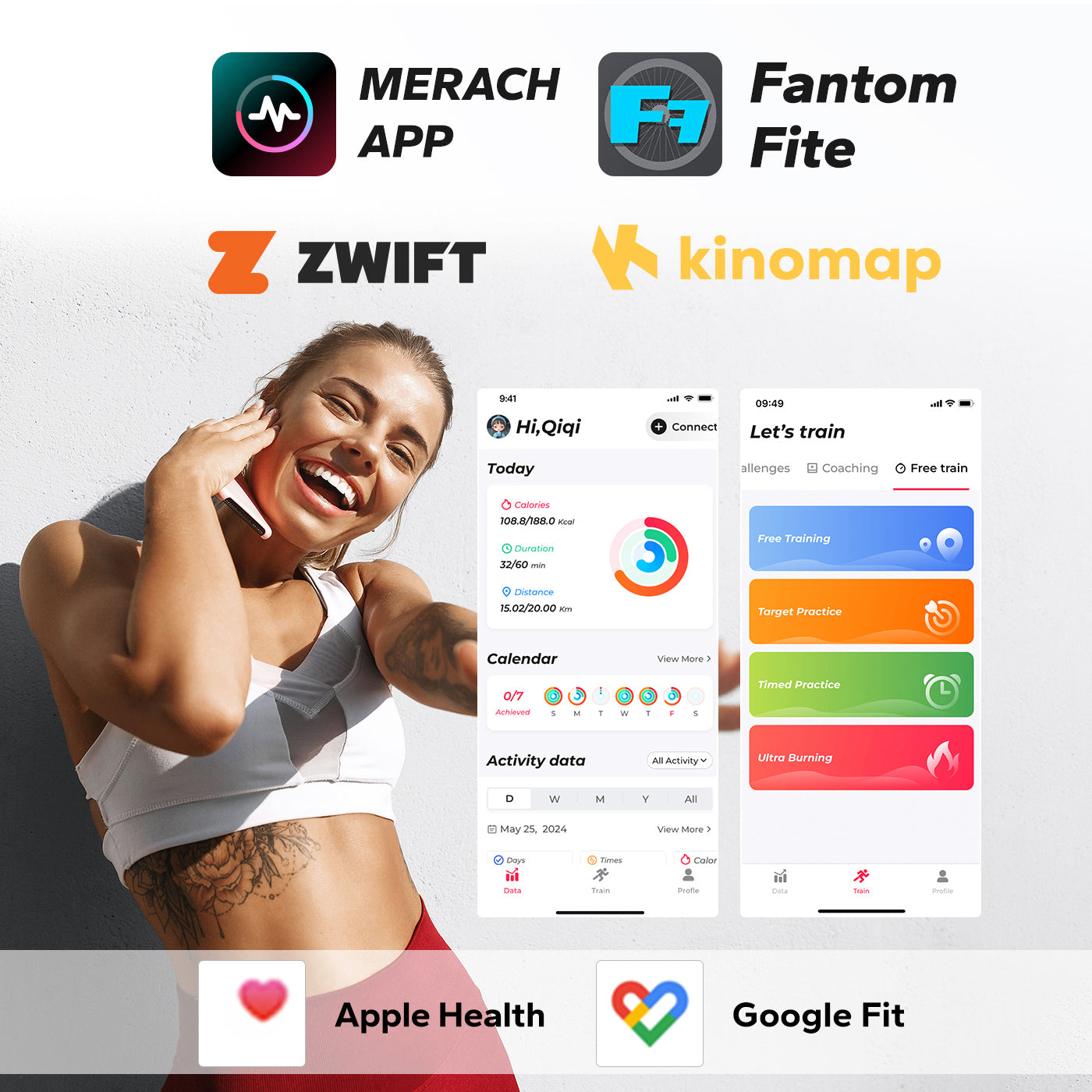 Merach, Kinomap, Zwift, Apple Health, Google Fit, Fanton Fite (By Merach)