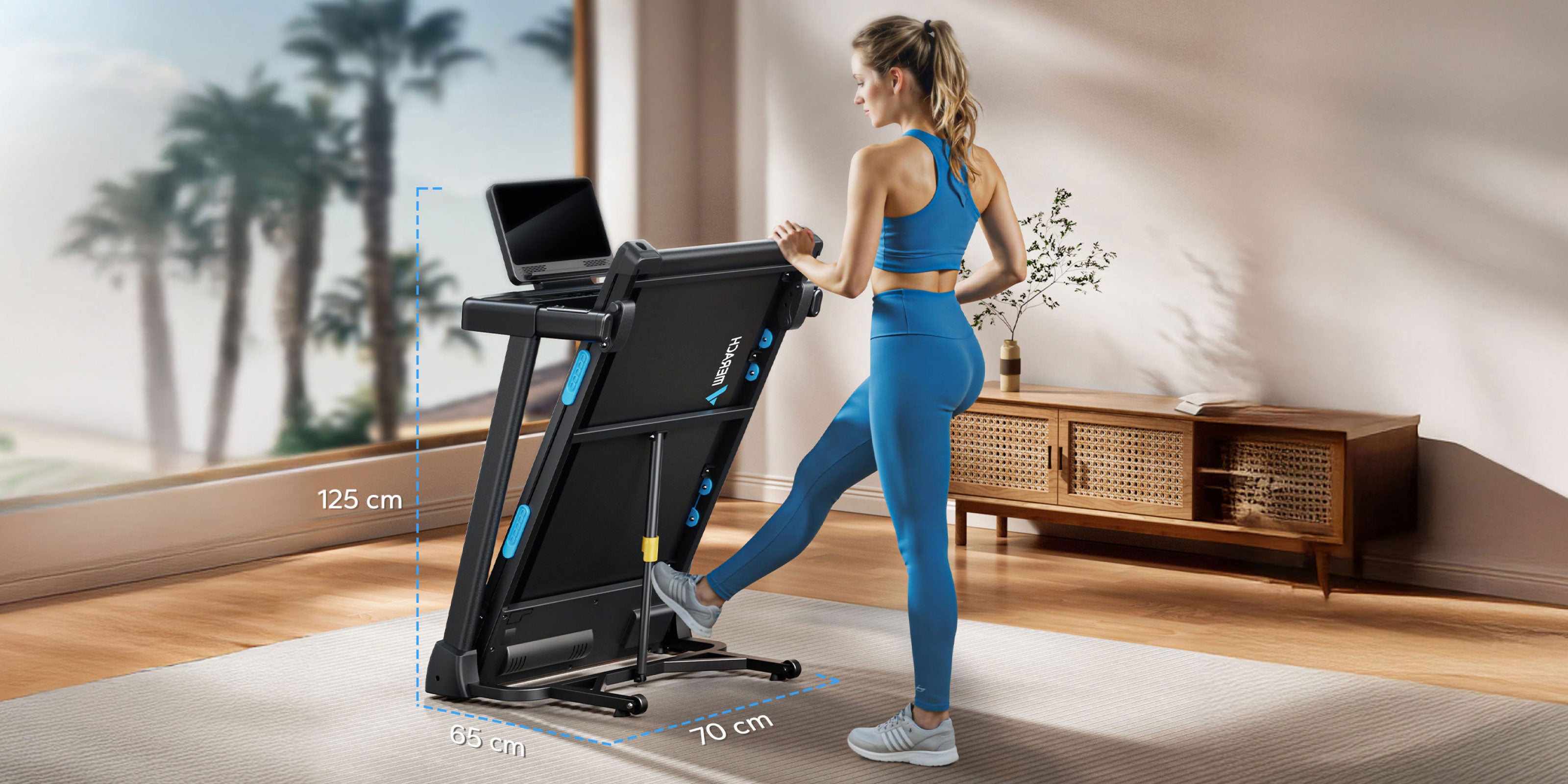 Faltmaße: 65 × 70 × 125 cm. Benötigt nur 0,45 m² – nur ein Drittel des Platzes eines Standardlaufbands.